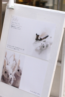 | Sallyはやはり「かわいい」のです。 Sleepy Sheep ; Soapの個展「Sally」も おかげさまで無事4日目を終えました。 先週のこのコーナーで、 「Sallyはどう表現してもかわいい」 なんて手前味噌なことを書いておりましたが、 毎日たくさんの方々から「かわいい〜!」という言葉を頂き、 改めて「かわいいものを生み出せて本当に良かったなあ」 と思う日々であります。 私の中では今回の個展が 「Sleepy Sheep ; Soap 第二期の始まり」 と位置づけております。 この機会にぜひぜひご来場下さいませ。 ※この看板が目印。 4/7(火)までの開催です。 5. April 2009 |